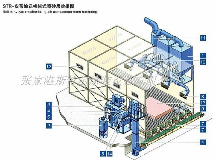 A perfect sandblast system has gas, and automatic back to sand gush arenaceous system, workpiece conveying system, and dust removal system and automatic control system is composed; The standard of the workshop project production line, such as boats repairing, container, large machinery, steel structure, pipe, the pieces of metal workpieces such as mass sandblasting processing.