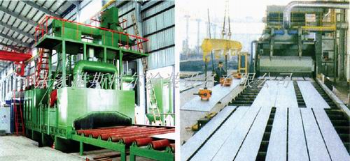 The steel pretreatment line mainly uses high speed rotating impeller of peen-forming to the surface with steel shot (projectile) speed .To the shock, scraping, in order to eliminate the surface of rusty layer, oxide skin and dirt surface, it reaches a certain roughness. Improve the paint film with steel surface adhesion, raise the products corrosion resistance and surface quality, improve and enhance the appearance of the products quality and internal quality, reduce the labor intensity of cleaning and environmental pollution, the product is ships, Bridges, locomotives, engineering machinery, chem